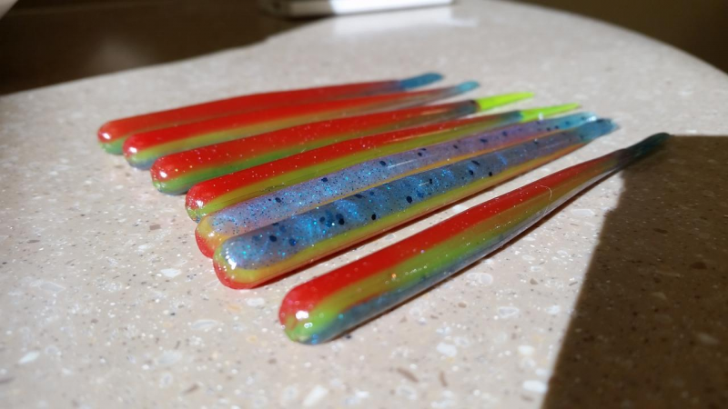| Description: Recently attempted to copy the new Roboworm color Morning Dawn Hologram. Here's a link to the color. http://www.carolinafishingtackle.com/store/ROBOWORM/Straight-Tail-Worm-6/Straight-Tail-6-Morning-Dawn-Hologram.html Personally, I am not a fan of the color but I had fun playing around with it. Hand poured the blue then dual injected the red and chart/green that combined the colors to cause the red to go orange and the chart/green to go yellow. Picture Stats: Views: 2526 Filesize: 80.46kB Posted by: Fishfulthiking Rating: This picture has not been rated yet.
