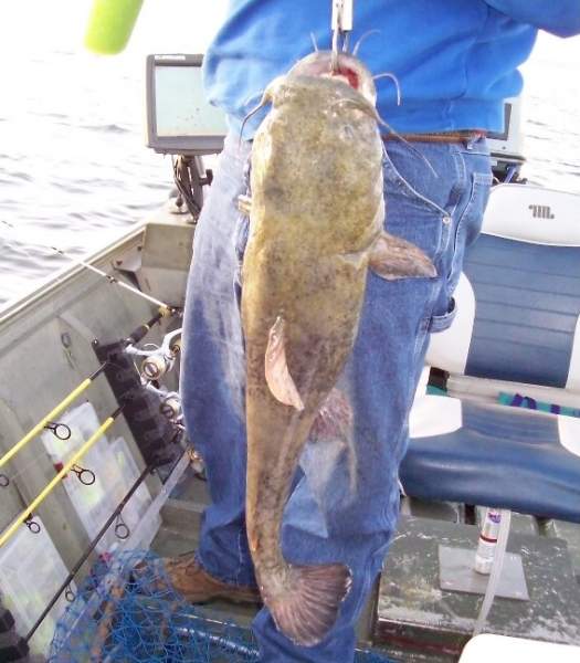 | Description: The fall feed is still on. Went back to the area we fished 11/02 and found a few more Flatheads. We caught one that weighed about 6lbs. on a 3" Pearl Regular Carrot to Boot ( Not the fish pictured ). I need to find some heavier jig hooks to get serious with this size ( have some in mind ). They are holding in an area with logs fairly close by. Catfish will hit vertically jigged baits ( like 3" Carrots ) if you are quiet while overhead. Keeping them out of the logs is another matter. Picture Stats: Views: 1132 Filesize: 117.62kB Posted by: pjmcla Rating: This picture has not been rated yet.