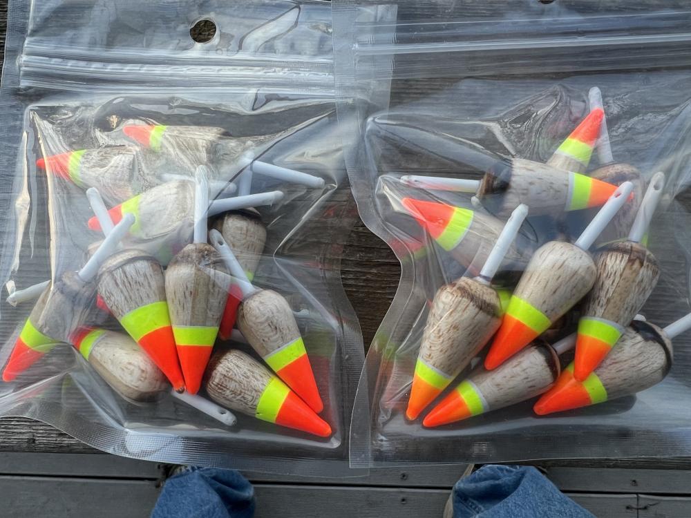 My daughter got me a new Dremel Tool for Christmas and I finally put it to work power-sanding balsa float bodies. Seen here are 23 that are headed for the tackle pail. They still will get some latex tubing on the white stems to make them static, or fixed, floats for water under 5 feet deep but can be used as is as a slip float. Throughout the open water season I use them both ways.