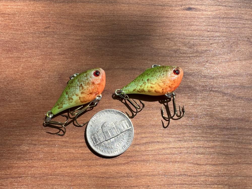 Here are a couple bright pumpkinseed lipless baits I sprayed up yesterday. Seems the crappies in our local lake have a taste for sunfish and pumpkinseed fry just about the same size as these guys are. So…. Gotta feed them what they like, eh?