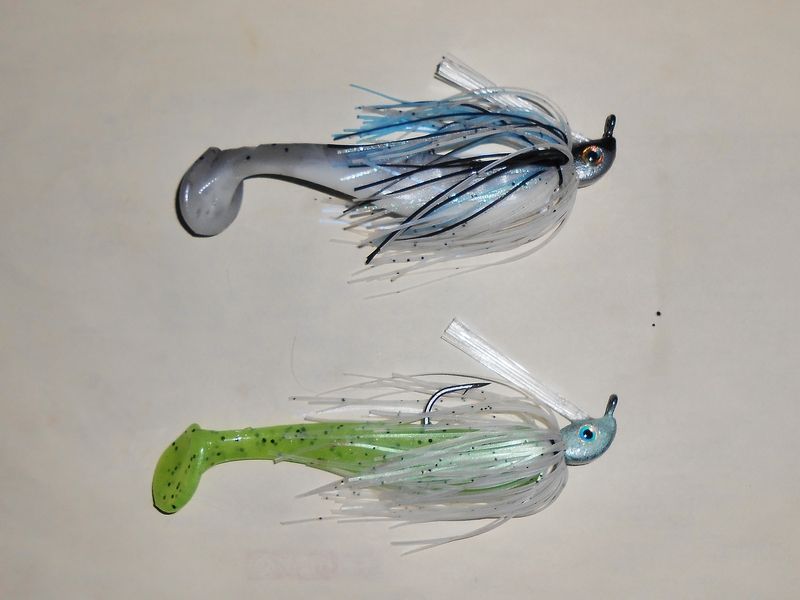 Here are my first 2 swim jigs of the season, I used Mo Quack's swim baits as the trailer on these and matched the color to them somewhat. I had really good success last year with these patterns so now I'm making sure I have a few extra, anyway, these are both 3/8oz baits. The top one I like to call "Black Back Shiner" and the bottom one is "Ghost Green Shiner", they were poured using the Do-it Trokar Pro Swim Jig Mold and I'm using 4/0 Eagle Claw 2706 Black Platinum hooks. The picture isn't great but the head on the top jig is silver with just a little tiny bit of candy blue dusted over it with the back done in smoke which is more of a gun metal color, really nice for this kind of thing. The skirt is 44 strands and it is 1 tab of blue interference pepper, 6 strands of clear with blue crystal (flash effect), 10 strands of sexy blue and 6 strands of flat black. The bottom head is a very light dust of pearl white, I hit it with just enough that the shine was knocked off the head but you could still see the lead, then I gave it just a quick dust of candy green, that gives you the ghost effect that you see shine but it has a faint color to it almost translucent, you can do that with any candy color and pearl but it has to be very light. The skirt is 44 strands also, it is 1.5 tabs of green glimmer pepper and 1/2 tab of pearl, the pearl breaks up the green glimmer effect of that color silicone. I don't know the colors of the tails but let me tell you, Mo Quack has some awesome stuff whether it is painting cranks or pouring plastics, the guy can do it all!!! Let me know what you think of my simple swim jigs, these really work well around wood and docks.