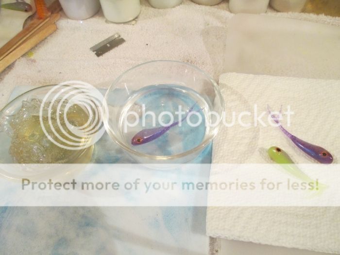 Keep in mind that care is of utmost of importance with water and hot plastic this close together. The dipped baits go right into the water, but you do NOT want the water to go into the plastic.