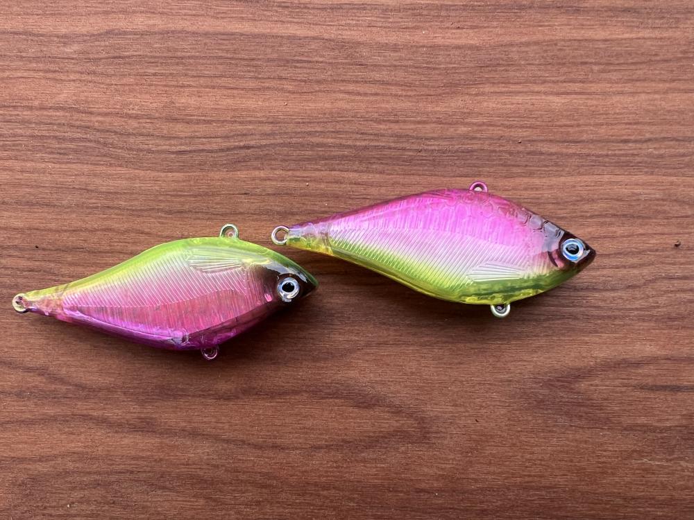 Here are a pair of Do-It’s #8627 , 1/2 ounce,foiled, lipless baits done using Bait Blast colors. There’s no base color. The belly is equal parts of Hot Yellow and Yellow Charreuse. The back and sides got Hot Pink and Perfect Pink- a pearl color- in equal parts. The backs were done with two coats of Purple Rain ( a transparent) and Purple Frost ( a pearl) in equal parts. The eye sockets and slight forehead were done with a thinned out black. Eyes are 2.5 Precision Pearl.