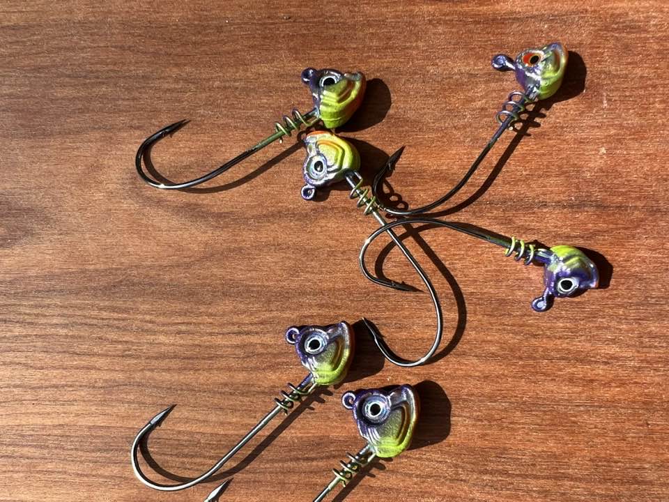 Here’s another picture of several jigs (the six on the bottom of the same pattern) done using a base coat of the Electric Shad, also airbrush applied, then finished with airbrush acrylics and sealed with CS Seal Coat. The eyes are Do-It’s Ninja Shad from their Attack series. The super glitter in the base coat crawls right thru the acrylic colors. Uncanny.