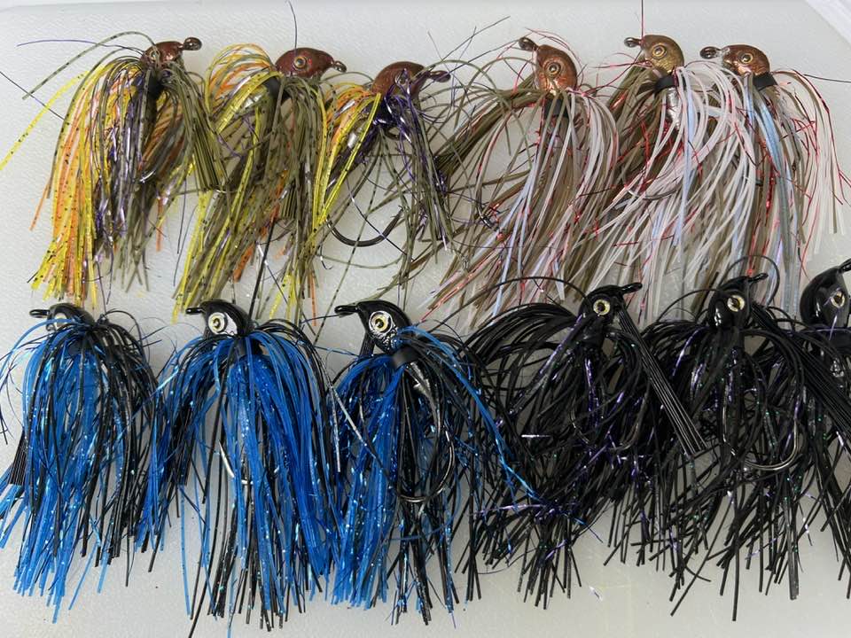 For skirts I opted for the Flash series of pre-banded skirts. Half of the black heads got the "Bruiser" skirt and the other half got the "Dark Matter" color. Both really make these baits stand out. The watermelon heads got split and half of them got "Bleeding Olive Shad" skirts and the remainder got the "Sun burned Gill". Again, these colors really make the jigs a standout.