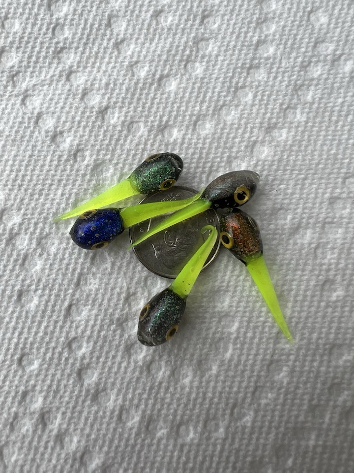 That Nano can be a challenge when splitting colors, adding harvested parts and then getting to cover dip on in a decent fashion but they do make a nice panfish bait for when the water temps are dropping and the sunnies and crappies are on the cussp of going deep and getting tight lipped.