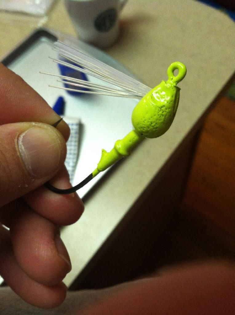 Your jig is not to hot,reduce the air flow through your fluid bed,and it will not do that,if it was to hot it would bubble up on the jig,if you use a fluid bed to much air creates air pockets in the powder thus creating the surface you have on that jig,I powder coat all my jigs,sonars,one eyes,everything and have been doing this for 20 plus years,my buddy just started and he had same problem,I told him the same thing,also if you have not baked your jig yet just heat it back up and with a rag you can wipe the jig clean and start over,just remember the surface you see before baking is what it will come out as,