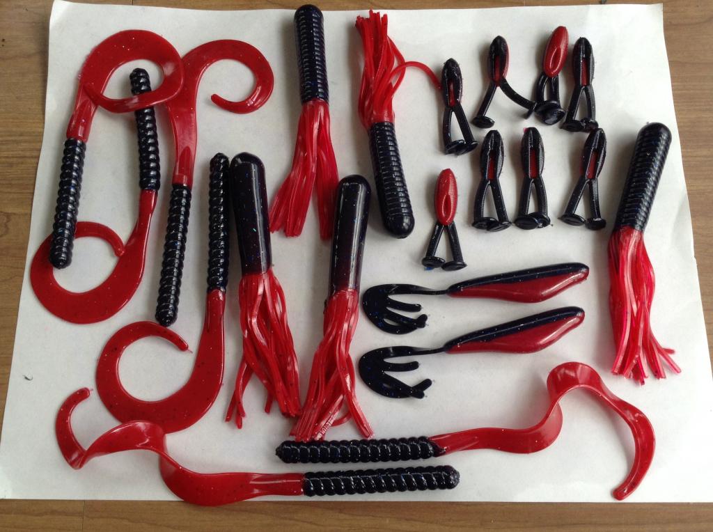 Tom, the black has A LOT of different remelt in it; hd, uv, different hilites, blue, black and purple baits, glitters... it's a big pile of junk! Thin appendages look grey if I shoot it straight up, it's an opaque dark smoke. To make the color on purpose I would probably start w/ 4-6 oz plastic, 2 drops black x2, 1 or 2 drops blue (or purple of your choice depending which way you want to go) x2, blue or violet hilite, .04 Canadian blue and blue holo string glitters. The red of course isn't straight up red either, and worked with scrap to match the following recipe: 4 oz plastic, 1/4 tsp russet pearlex, 1/8 tsp red .04, 15 or so drops red (non x2)- basically enough to pull it away from russet towards being red. Also a touch of violet hilite. 2 tubes and the swimshad pictured are shot with this recipe, everything else in this red color is worked from scrap.