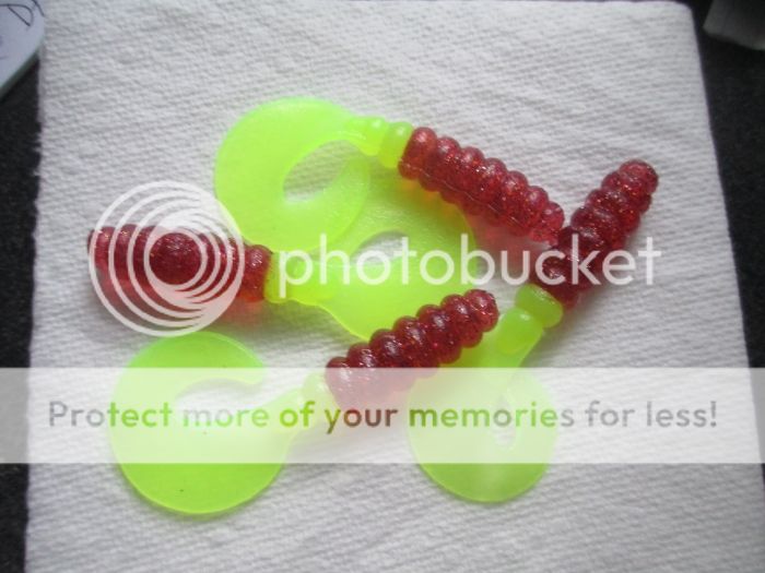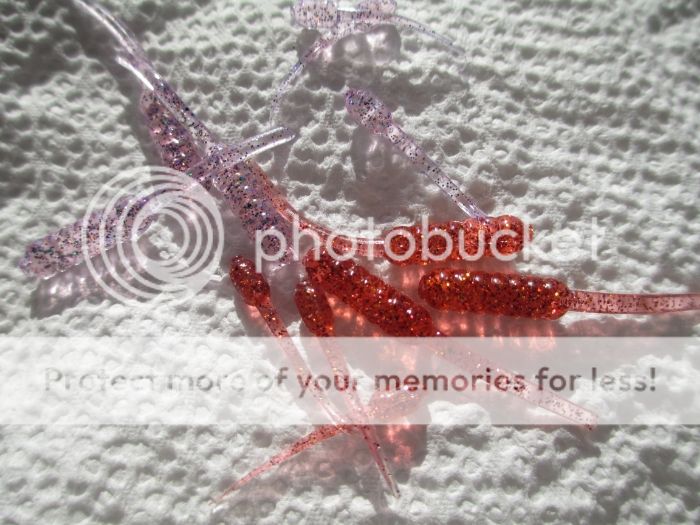 The pinkish one is cotton candy....sort of. I called the brown one winter crawfish. The plastic in each instance was as clear as crystal before the glitter went in. I am assuming the purple glitter in the cotton candy bled to render the pink hue. It was supposed to be my bluegill color....go figure. But instead its a perfect cotton candy, so that's what it is. The brown craw gets its color from a brown glitter that I thought would go well with gold and red. There is nothing in the plastic to color it except the bleeding glitter colors. The lesson here is never call anything ruined until it really is ruined. Man, am I happy that I saved the glitters I used.