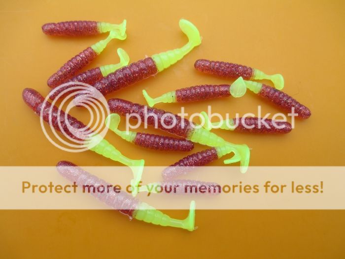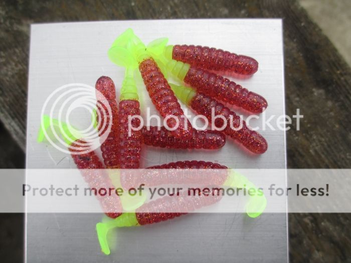 Quiet a while ago I bought a bunch of micro glitters [not Do-It glitters] and after the first use I determined that for what I wanted at the time they weren't going to work for me. Being a pack rat they went in the closet. Now fast forward about 18 months. I got some questions from a person regarding winter plastics and colors and what not. He had some very specific color requests so I agreed to shoot up some samples for him. I came across these two that were bagged on a hook in the closet that came from my exploration with the micro glitter bleeders. For jollies I included a few of each in his sample packet. Actually I sent his order and threw a few of each of the two colors here in as sample. Well, he loved these two. The fish loved these two. Now he wants more. Many, many, more. Of each bait.