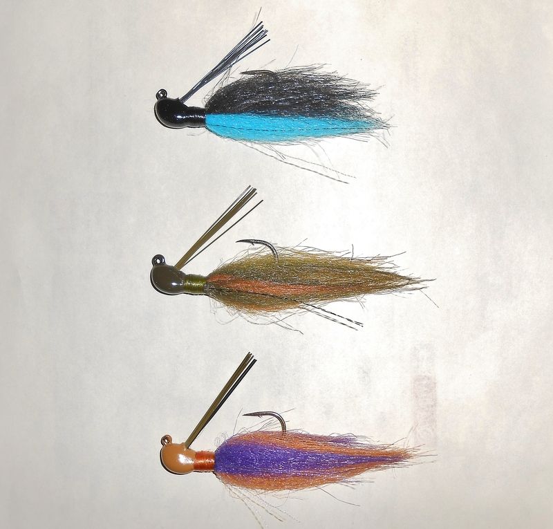 I've been tying a bunch of these getting ready for ice out!!! Last year we did good at the end of the season on these only they were tied on 1/4oz ball heads with a larger weed guard and it was a little too much for the spots we found fish on. So, based on what happened last year I decided to make some changes, I went with a 3/16oz head as the 1/4 was good but I'm thinking a slightly slower fall will help, and I used an FG-12 weed guard as the cover we fished amounted to some small limbs off of brush piles that have been moved and only some sticks remain. Anyway, here they are, I'm hoping these work well as they are going to have some Zoom Super Chunk Jr.s on the back as trailers. The top one is black and fluorescent blue, the middle is green pumpkin camo, and the bottom is PB&J and there are two others I didn't take a picture of, and they are black and chartreuse and watermelon camo, let me know what you think, good or bad.